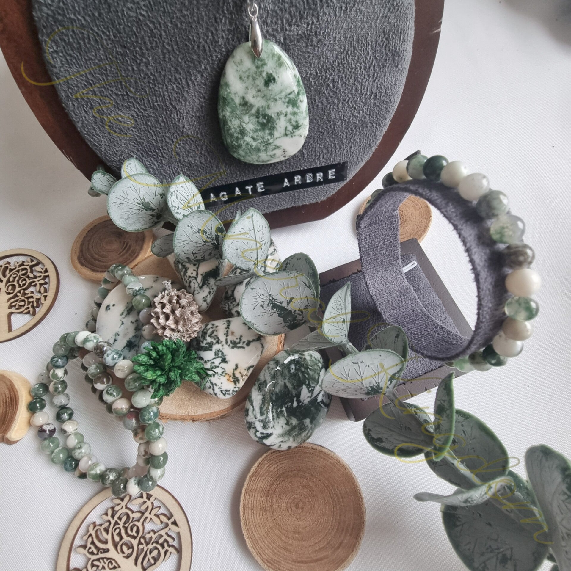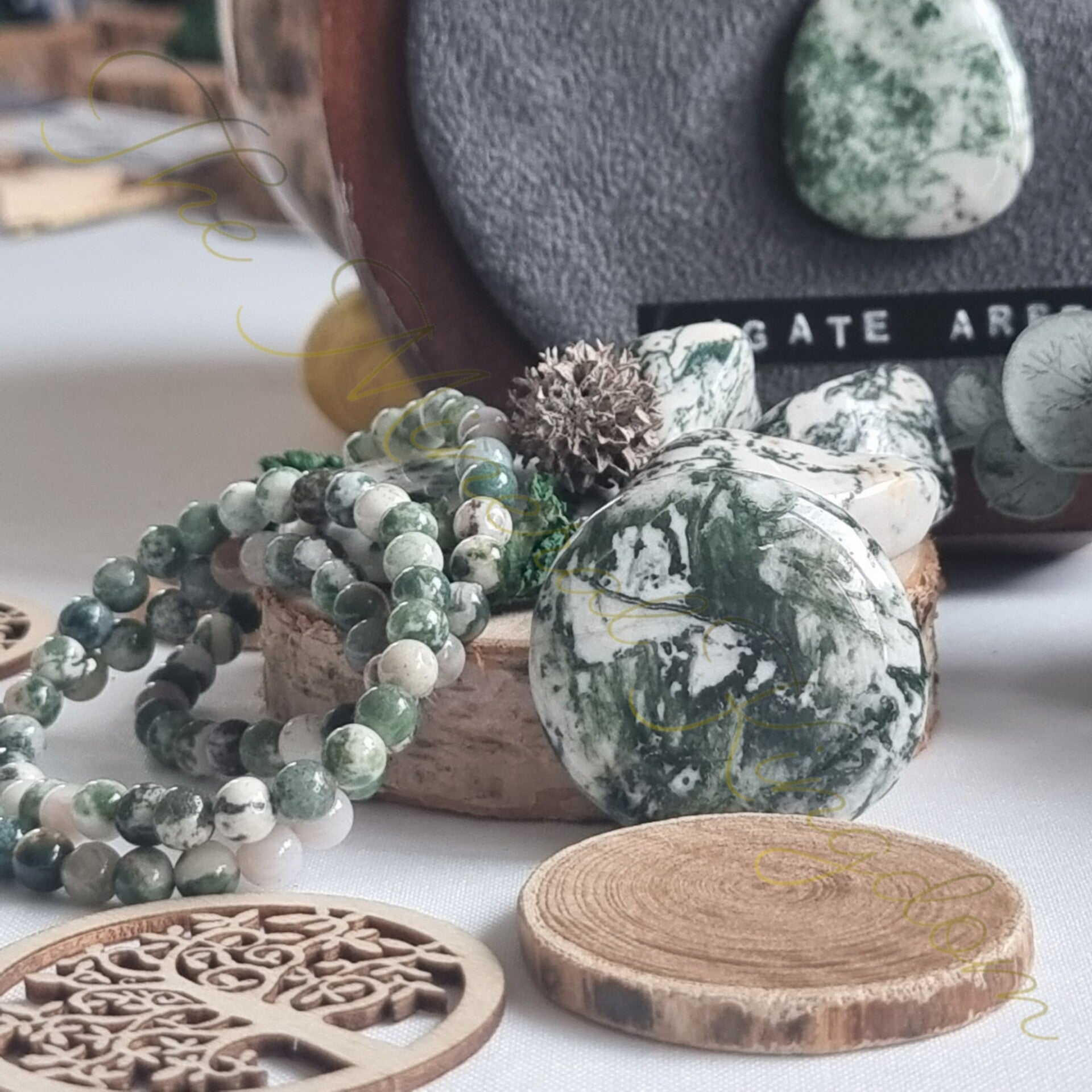 L'Agate arbre est la soeur de l'Agate Mousse, à la différence de cette dernière, l'Agate arbre présente des nervures (dentrites) rappelant le feuillage vert et les branches d'arbres sur une couleur de fond opaque blanche. Elle peut aussi présenter des nuances gris/bleu clair